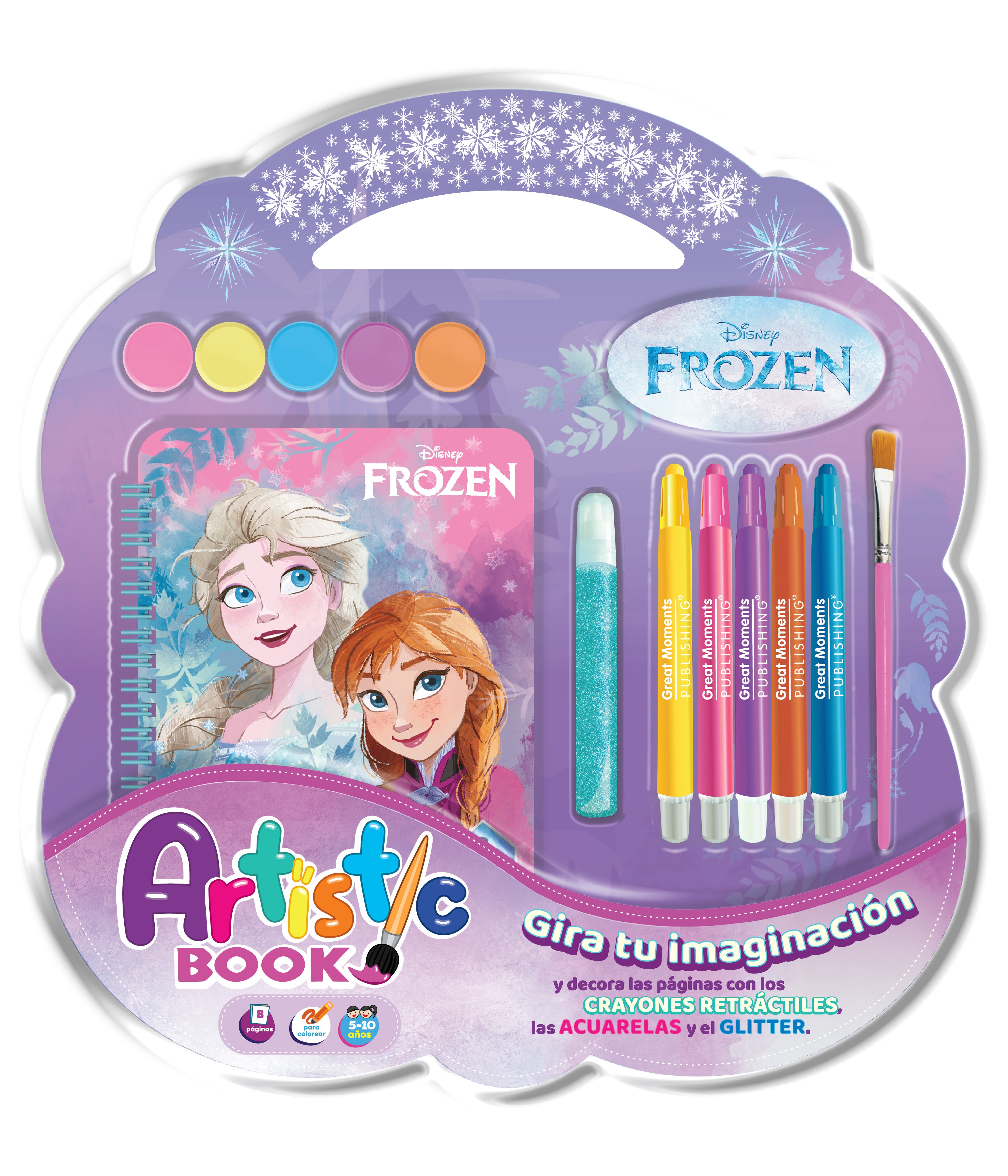 Libro que cuenta con 8 páginas para colorear con diseños de Frozen, junto a este pequeño libro para colorear, viene todo un juego para decorar de crayones retráctiles, acuarelas y glitter.